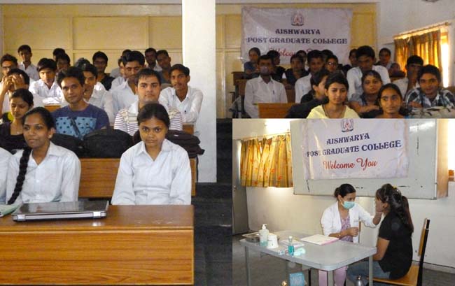 world health day celebrationउदयपुर , ऐश्वर्या महाविद्यालय में आज विश्व स्वास्थ्य दिवस के अवसर पर विद्यार्थियों हेतु निःशुल्क दन्त परीक्षण शिविर का आयोजन कर मनाया गया जिसमें डॉ. हरलीन नरूला ने अपनी सेवाएं दी। प्राचार्य डॉ. विजयलक्ष्मी परमार ने बताया कि शिविर के प्रारम्भ में डॉ. हरलीन नरूला ने दांतों से सम्बन्धित विभिन्न जानकारियां से विद्यार्थियों को अवगत कराया। जिसमें उन्होंने दांतों की सफाई कब और कैसे करनी चाहिए, दांतों के लिए कौनसा मंजन व किस तरह का ब्रश उपयुक्त रहता है, दन्त संरचना, दांतो के विभिन्न भाग आदि के बारे में बताया। तद्पश्चात् उन्होने महाविद्यालय में अध्यनरत विद्यार्थियों का दन्त परीक्षण किया तथा दांतों से जुड़ी समस्याओं का समाधान किया।