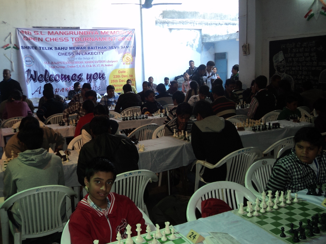 श्री तैलिक साहू मेवाड़ बैठक सेवा समिति द्वारा चेस इन लेकसिटी के तत्वावधान में चतुर्थ शंकरलाल मंगरूड़िया स्मृति ओपन शतरंज प्रतियोगिता का आगाज गुलाब बाग रोड़ स्थित साहू पब्लिक स्कूल में हुआ। आयोजन सचिव विकास साहू ने बताया कि प्रतियोगिता में कुल 95 शातिर हिस्सा ले रहे है जिसमें से 11 फिडेरेटेड खिलाड़ी है। प्रतियोगिता के दुसरे चक्र में चन्द्रजित सिंह राजावत ने उलटफेर करते हुए पहली वरियता प्राप्त अतुल हिंगड को हराकर धमाका किया। इस से पूर्व प्रतियोगिता का उद्घाटन मेवाड़ बैठक अध्यक्ष मिठ्ठालाल नेणावा द्वारा किया गया। विशेष अतिथि विजय पंडियार, अनिल मगरूड़िया, जगदीश पडियार, व अध्यक्षता साहू शिक्षा समिति के अध्यक्ष रामलाल रेगा द्वारा की गई।