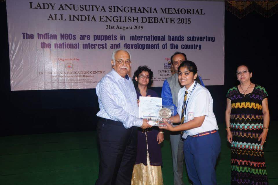 उदयपुर, लेडी अनुसुया सिंघानिया की स्मृति में 30-31 अगस्त 2015 को आयोजित अखिल भारतीय अंग्रेजी वाद-विवाद प्रतियोगिता 2015 में छात्रा हिमाद्री शर्मा (कक्षा-11 बी) ने 27 विद्यालयों के बीच द्वितीय स्थान प्राप्त कर पांच हजार पांच सौ रूपयों का नगद पुरस्कार एवं ट्रॉफी प्राप्त की एवं मृगानिका सिंह तंवर (कक्षा-10 जी) को सांत्वना पुरस्कार में द्वितीय स्थान के साथ चार हजार का नगद पुरस्कार प्रदान किया गया। महाराणा मेवाड़ पब्लिक स्कूल ने राष्ट्रीय स्तर पर तृतीय स्थान अर्जित किया।
