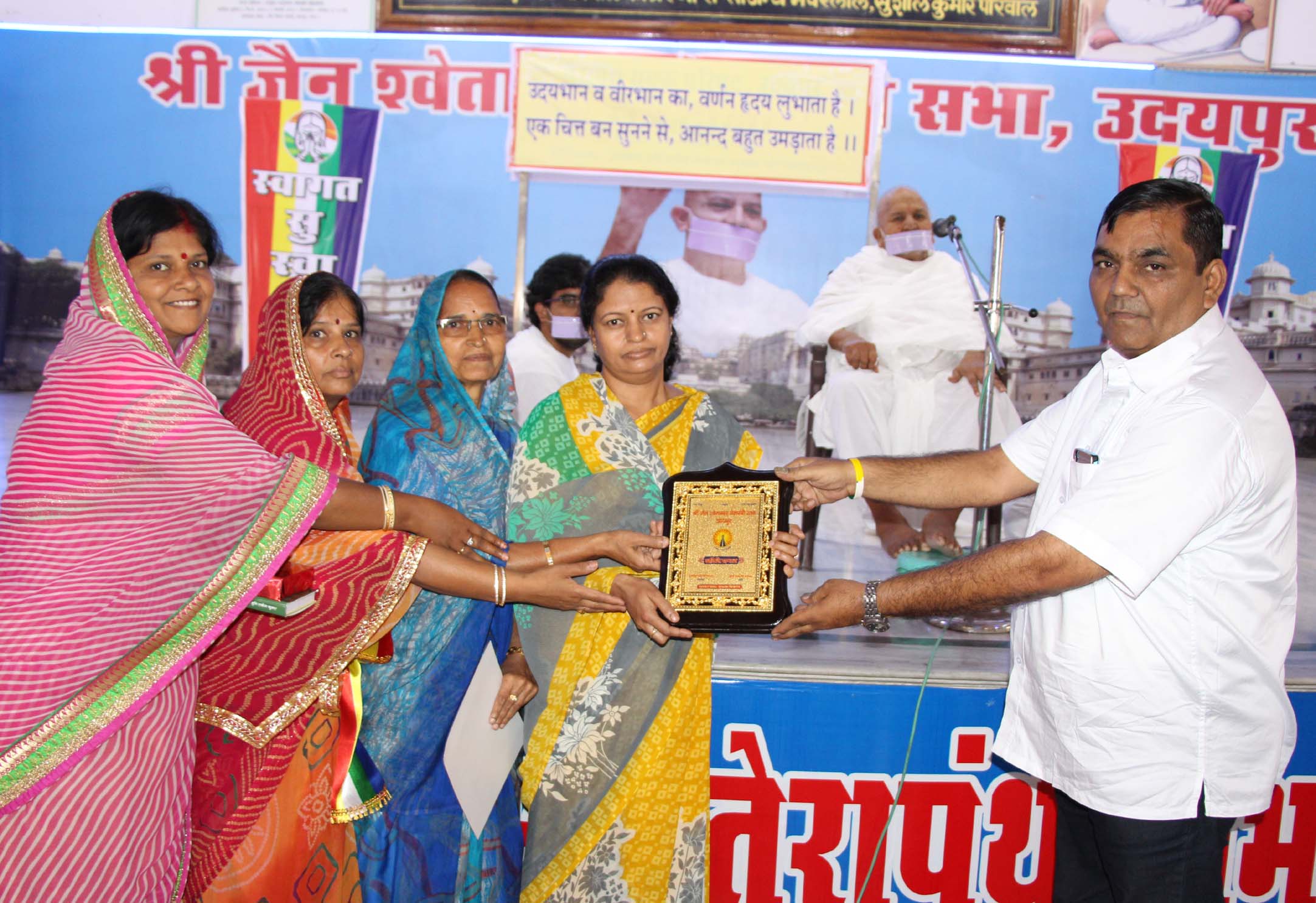 उदयपुर. उदयपुर. अखिल भारतीय स्तर पर तेरापंथ दर्शन एवं तत्वज्ञान परीक्षा में उदयपुर की संगीता पोरवाल ने पूरे देश में प्रथम स्थान प्राप्त किया है। स्थानीय परीक्षा प्रभारी इन्दूबाला पोरवाल ने बताया कि मुनि राकेश कुमार, मुनि सुधाकर, मुनि दीप कुमार के सानिध्य में संगीता पोरवाल का सभाध्यक्ष राजकुमार फत्तावत, महिला मंडल अध्यक्ष चन्द्रा बोहरा, युवक परिषद अध्यक्ष दीपक सिंघवी, संरक्षिका शशि चव्हाण ने साहित्य, उपरणा, प्रशस्तीपत्र एवं स्मृति चिन्ह देकर सम्मानित किया। इस अवसर पर सुचिता बोहरा, मनीषा पोरवाल, डॉ. विजयलक्ष्मी नेनावटी, आजाद तलेसरा, मीनाक्षी जैन, सुशीलादेवी भोलावत का भी इस परीक्षा में विशेष योग्यता प्राप्त करने पर साहित्य, उपरणा एवं प्रशस्ति-पत्र द्वारा सम्मान किया गया। सभाध्यक्ष राजकुमार फत्तावत ने बीकानेर में बदनी देवी डागा के 51 दिन के संथारा संलेखना पूर्ण होने के मृत्यु महोत्सव का अनुमोदन किया। कार्यक्रम में सफल अभ्यर्थियों को आशीर्वचन प्रदान किया।