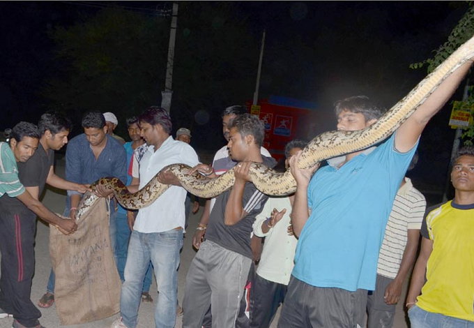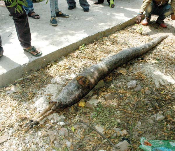 बूंदी/उदयपुर. नीलगाय के छह माह के बच्चे को निगलने के चक्कर में एक अजगर अपनी भी जान गंवा बैठा। आए दिन निकल रहे अजगर के कारण आस-पास के लोग दहशत में हैं। मंगलवार को वन्यजीव प्रेमी विट्ठल सनाढ्य ने रामगढ़ विषधारी अभयारण्य में सूखी खाळ में एक अजगर (पायथन) के पड़े होने की सूचना वन विभाग को दी। मौके पर पहुंचे वनकर्मी साढ़े आठ फीट लंबे इस अजगर को बूंदी पशु अस्पताल लाए। पशु चिकित्सालय के डिप्टी डायरेक्टर डॉ. केएल युगल ने बताया कि नीलगाय के बच्चे को निगलते समय मादा अजगर का श्वांस तंत्र बंद हो गया था, जिससे उसकी मौत हुई।