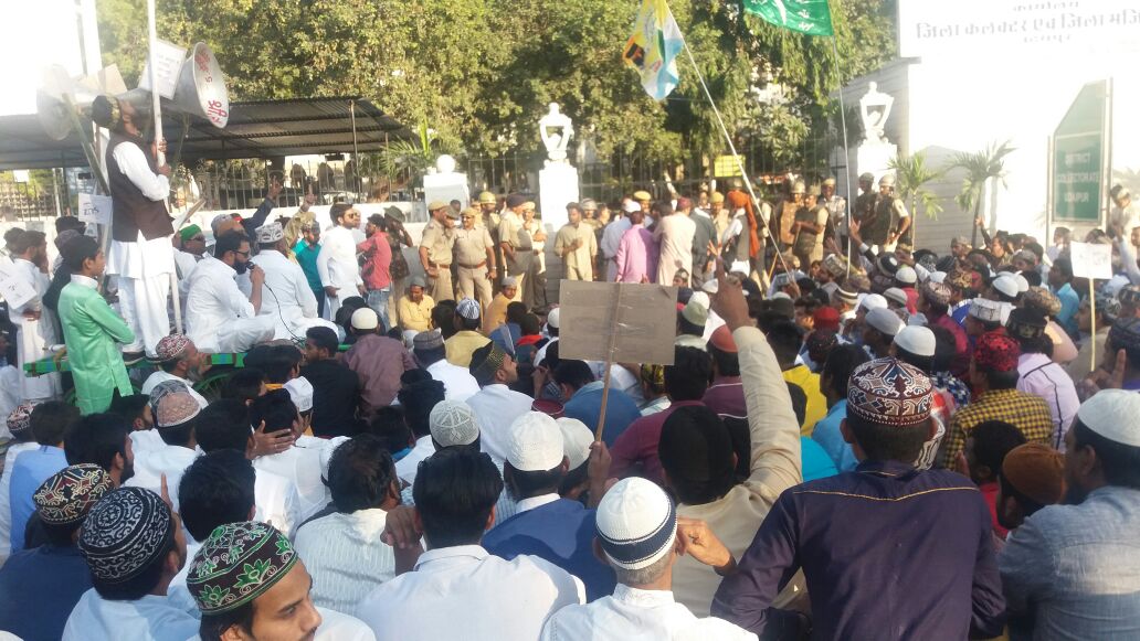 तीन तलाक के विरोध में केन्द्र सरकार द्वारा सुप्रीम कोर्ट में याचिका लगा शरिया कानून में तीन तलाक के मामले में बदलाव करना चाहती है। केन्द्र सरकार के इस निर्णय का देश भर के मुस्लिमों द्वारा विरोध किया जा रहा रहा है। इसी क्रम में आज उदयपुर का मुस्लिम समाज लामबंद हो गया। जुमा की नमाज के बाद अंजुमन चोक में काफी संख्या में लोग एकत्र हो गए और मौन जुलुस के रूप में जिला कलेक्ट्री पहुचे। जुमा की नमाज़ के बाद शहर के विभिन्न क्षेत्र मुल्लातलाई, सज्जन नगर, सविना, आयड़, बरकत कोलोनी, रजा नगर, खांजीपीर, धोलिबावादी, सिलावट वाडी आदि कई मुस्लिम मोहल्लों से भारी संख्या में लोग अंजुमन पहुचे वहां से जुलुस के रूप दिन मेंतीन बजे रवाना हुए। जुलुस अंजुमन से झीनी रेत चोक सूरजपोल, बापूबाजार, देहली गेट होते हुए जिला कलेक्ट्री पंहुचा वहां पर एक बार केन्द्र सरकार के इस फैसले के खिलाफ युवाओं द्वारा नारे बाजी भी की गयी लेकिन बाद में समाज के लोगों के समझाने पर नारे बंद हुए। जिला कलेक्टर को पांच सदस्य ज्ञापन देने पहुचे। राष्ट्रपति के नाम ज्ञापन में साफ़ लिखा गया कि केन्द्र सरकार तीन तलाक के मुद्दे पर राजनीति करना चाहती है और शरिया क़ानून में बदलाव करना चाहती है। देश का कोई भी मुसलमान शरिया कानून में बदलाव के पक्ष में नहीं है। शरिया कानून में औरतों को पूरा हक़ दिया गया है। कई भ्रमित बाते फैला कर इस्लामी शरिया कानून के खिलाफ भ्रम फैलाया जारहा है जो स्वीकार नहीं किया जायेगा। जुलुस और धरने के दौरान पांच हज़ार से अधिक लोग जिला कलेक्ट्री के बाहर बैठे रहे विरोध प्रदर्शन करते रहे। जुलुस के दौरान समाज के कई नेता और ओलमा ए किराम शामिल हुए थे। इस अवसर पर अंजुमन तालीमुल इस्लाम सैक्रेट्री रिजवान खान, अशरफ जीलानी, अकीलुद्दीन सक्का, नजर मोहम्मद, पूर्व सदर शराफत खान, फारूख हुसैन, मुनव्वर अशरफ, मुजीब सिद्दीकी, पूर्व पार्षद नासिर खान, पार्षद मोहसिन खान, पार्षद राशीद खान, मोहसिन हैदर, पप्पु भाई मेवाफरोश, मकबुल हुसैन मेवाफरोश, इकबाल बाली, जाकिर हुसैन, तबरेज खान, रियाज हुसैन, मुर्तजा हुसैन, मुस्तफा, शोएब खान, गुलाम दस्तगीर, उलमाए दीन में मुफ्ती नईमुल्लाह फैजी, मुफ्ती मुर्तिउर्रेहमान, मुफ्ती बद्रे आलम, मौलाना शरफुद्दीन, मौलाना आस मोहम्मद, मौलाना जुलकरनैन, मौलाना मुसन्ना रजवी सहित कई समाज के मोतबिरान व हजारों मुस्लिम लोग मौजूद थे।