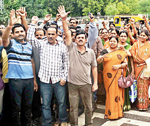 उदयपुर। शिक्षकों ने बुधवार दोपहर जिला कलेक्ट्री पर प्रदर्शन करते हुए एकीकरण और विद्यालयों के समय परिवर्तन को लेकर विरोध दर्ज कराया। राजस्थान पंचायती राज शिक्षक संघ के बैनर तले शिक्षकों ने दोपहर बाद सामूहिक अवकाश लेते हुए विरोध प्रदर्शन में हिस्सा लिया। जिलाध्यक्ष शेर सिंह चौहान के नेतृत्व में जिला कलेक्ट्री पर जोरदार नारेबाजी करते हुए शिक्षकों ने सरकार के निर्णय पर आपत्ति दर्ज कराई। प्रदर्शन के बाद जिला कलेेक्टर को मुख्यमंत्री व शिक्षा मंत्री के नाम ज्ञापन भी सौंपा।