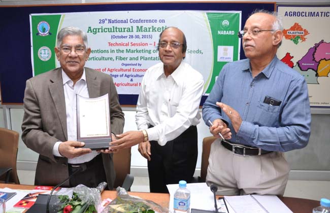 उदयपुर , एम पी यू ए टी में कृषि अर्थशास्त्र विभाग एवं भारतीय कृषि विपणन समिति (आई एस ए एम, हैदराबाद) के साझा प्रयास से आयोजित तीन दिवसीय कृषि विपणन सम्मेलन का समापन शुक्रवार को अनुसंधान निदेशालय में संपन्न हुआ। सम्मेलन के समापन सत्र की अध्यक्षता आई एस ए एम के अध्यक्ष प्रो. आर राधाकृष्णन ने की। इस अवसर पर, अर्थशास्त्र विभागाघ्यक्ष तथा सम्मेलन के आयोजन सचिव डॉ. एस एस बुरड़क, सोसाइटी के सचिव डॉ टी सत्यनारायणन, जाने माने अर्थशास्त्री – कृषि लागत एवं मूल्य आयोग के पूर्व अध्यक्ष डॉ एस एस आचार्य, जे एन यू की एमिरिटस प्रो.शीला भल्ला सहित अनेक कृषि अर्थशास्त्र विशेषज्ञ उपस्थित थे।