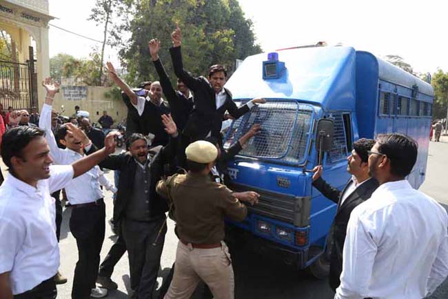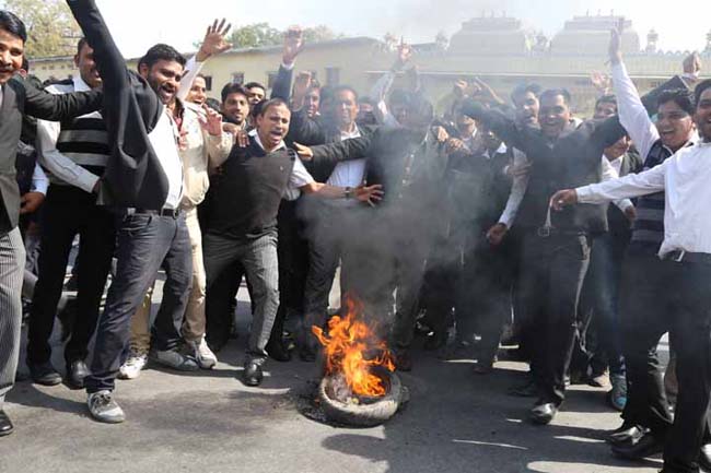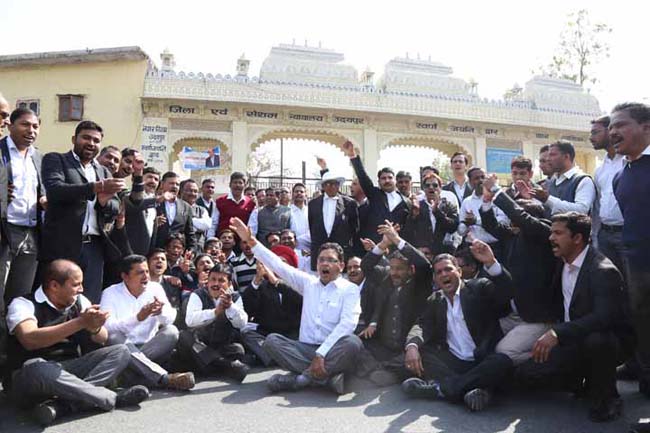 इधर अधिवक्ताओं ने बी हाईकोर्ट बैंच की मांग को लेकर जोरदार प्रदर्शन किया और न्यायिक कार्यों का बहिष्कार किया। रविवार को बार एसोसिएशन के अधिवक्ताओं का एक प्रतिनिधि मंडल मुख्य मंत्री की उदयपुर दौरे के दौरान अम्बियंस होटल मिलाने के लिए गा था। बार एसोसिएशन ने जिला प्रशासन से मुख्य मंत्री से मिलने का पहले ही टाइम लेरखा था घंटों तक एम्बिशयन होटल के बाहर मिलने के इंतज़ार में खड़े रहे जिसमे पूर्व विधानसभा अध्यक्ष शांतिलाल चपलोत भी मौजूद थे। मुख्य मंत्री वसुंधरा राजे ने प्रतिनिधि मंडल से मिलने के लिए समय तक नहीं दिया जिला प्रशासन के नुमाइंदे प्रतिनिधि मंडल को इधर से उधर घुमाते रहे। आखिर मुख्य मंत्री चली गयी और जाते जाते यह कह गयी “हाईकोर्ट बैंच नहीं मिल सकता” चीफ जस्टिस ने मना कर दिया। सरकार द्वारा कब चीफ जस्टिस को सिफारिश भेजी ? क्या लिखित में जवाब आया ? इस सम्बन्ध में कुछ भी नहीं बताया। पीछे चल रहे ग्रह मंत्री गुलाबचंद कटारिया, जलदाय मंत्री किरण माहेष्वरी और अन्य जनप्रतिनिधि भी इस सम्बन्ध में कुछ नहीं बोले। आक्रोशित अधिवक्ताओं ने आज आंदोलन छेड़ दिया और न्यायिक कार्यों का बहिष्कार कर कोर्ट चौराहे पर रास्ता जाम कर प्रदर्शन किया । आक्रोशित अधिवक्ताओं ने कोर्ट चौराहे पर दो घंटे तक ट्राफिक जाम रखा और जम कर प्रदर्शन किया। मानव श्रृंखला बनाई, टायर जलाकर अपने गुस्से का इजहार किया। चौराहे पर हुई सभा में संभागीय संयोजक शांतिलाल चपलोत, संभागीय सचिव अरूण व्यास, पूर्व संयोजक रमेश नंदवाना, बार अध्यक्ष भरत कुमार जोशी, महासचिव रामलाल जाट, जिला संयोजक सत्येन्द्रपाल सिंह छाबडा, भरत वैष्णव, कमलेश दवे, मन्नाराम डांगी, गोतम लाल सिरोहिया आदि ने मुख्यमंत्री पर वादा खिलाफी का आरोप लगाया। वक्ताओं ने अगस्त 2014 में मुख्यमंत्री के उदयपुर प्रवास के दौरान किये गये वादे, आदिवासी अंचल के आधार पर हाईकोर्ट बैंच स्थापना सम्भव होने बाबत् दिये आश्वासन, विधि सचिव व मुख्य सचिव से बनाई रिपोर्ट के बावजुद उस पर डेढ वर्ष से कार्यवाही न करने एवं बिना किसी मंत्री मण्डलीय प्रस्ताव के, बिना उच्च न्यायालय अथवा केन्द्र सरकार को आधिकारिक रूप से अनुशंसा किये ही मुख्य न्यायाधीश द्वारा मांग को नामंजुर करने के वक्तव्य को छलावा मात्र कहते हुए इसे मेवाड वागड क्षेत्र की जनता का अपमान बताया। वक्ताओं ने जनप्रतिनिधियों द्वारा भी मुख्यमंत्री पर दबाव न बनाने, बिना अनुशंसा के ही मांग को निरस्त कर देने का विरोध न करने पर अफसोस जाहिर किया। अधिवक्ताओं ने जिला प्रशासन के नकारापन व प्रतिनिधिमण्डल का ज्ञापन दिला पाने में असफल रहे पर निन्दा प्रस्ताव पारित किया गया। वही मुख्यमंत्री के वक्तव्य की कड़ी आलोचना करते हुए उन्हे स्वय