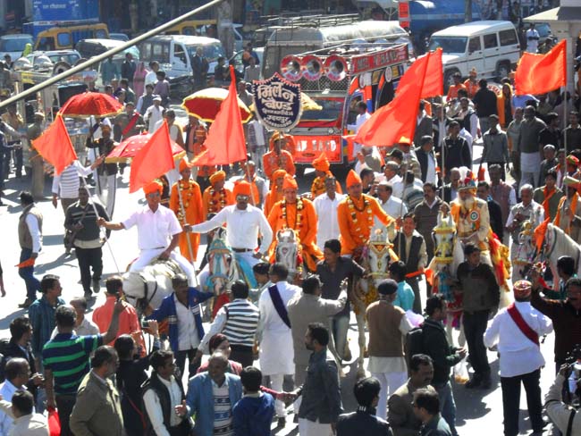 इन चारों शोभायात्रा का महासंगम सूरजपोल चौराहे पर हुआ जहां से शोभायात्रा ने एक विशाल रूप धारण कर लिया। विशाल शोभायात्रा सूरजपोल चौराहे से सीधी टाउनहॉल पहुंची जहां शोभायात्रा का समापन हुआ।